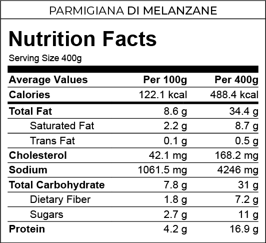 Eggplant, Flour, Free Range Eggs, Salt, Extra Virgin Olive Oil, Sunflower Oil, Mozzarella, Parmesan, Garlic, Onion, Bay Leaves, Basil, Sugar, Tomatoes, Nutmeg, Origanum, Black Pepper, Milk, Butter, Cream.
