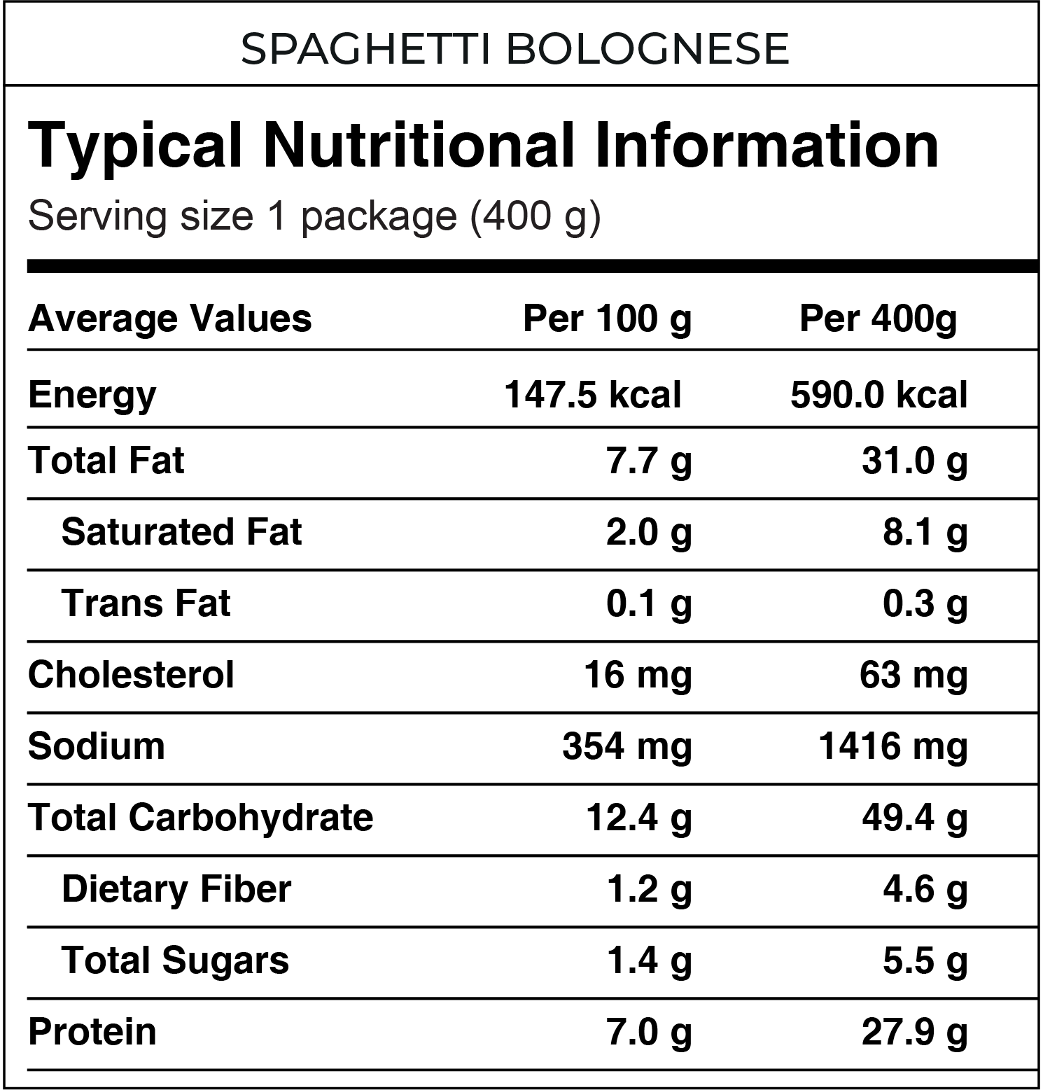 100% Imported Durum Wheat Pasta, Topside Beef Mince, Extra Virgin Olive Oil, Tomatoes, Origanum, Black Pepper, Garlic, Celery, Onions, Carrots, Red Wine, Bay Leaves, Salt, Parmesan.